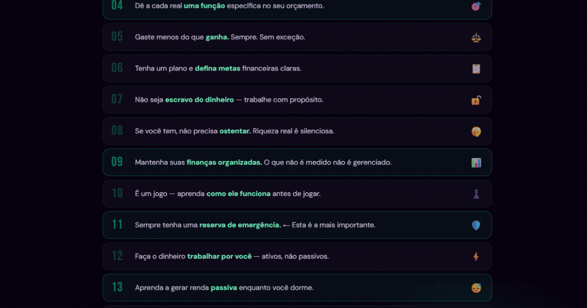 Por onde começar: Se você ainda não aplica nenhuma dessas regras, comece pelas três mais impactantes: crie sua reserva de emergência (regra 11), defina quanto vai guardar todo mês antes de gastar (regra 1) e estude uma forma de gerar renda extra com o que você já sabe (regra 13).